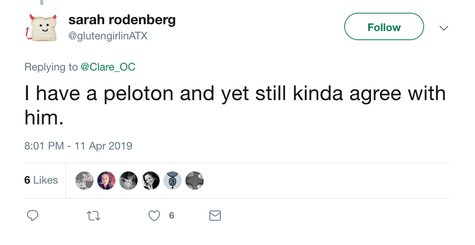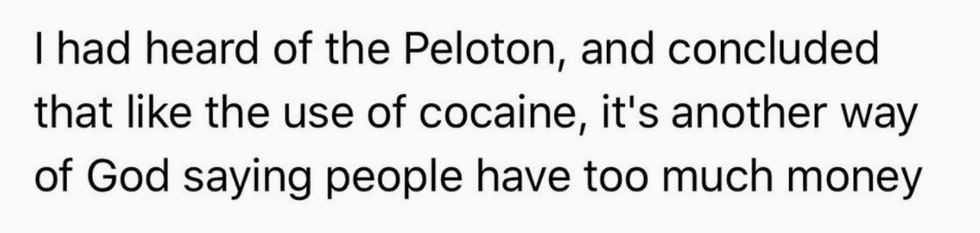 Yo @ glutengirlinATX, if you really think owning a Peloton is evidence from God that you have too much money, know that there are a lot of worthy causes you could be donating towards. For instance, I want a Playstation 4.