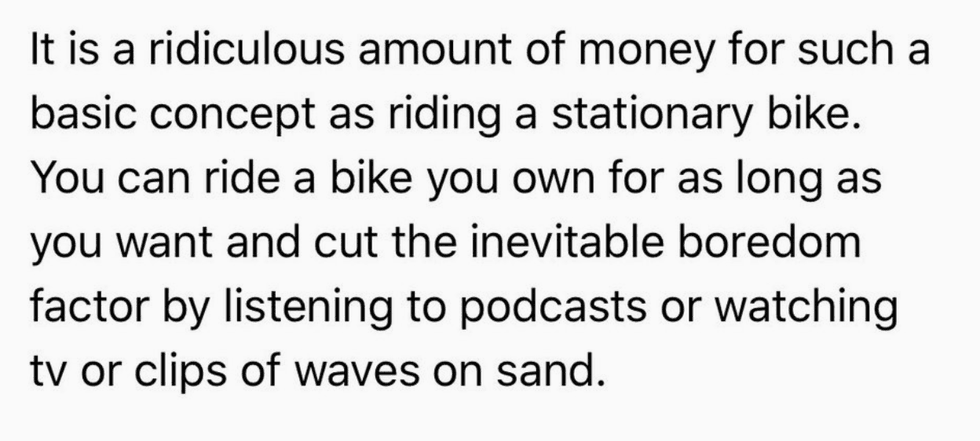 Well, as it turns out, the Peloton might not be the best use of Claire's money. Or really, anyone's money. There are some, how should we say, hang-ups to the Peloton experience.