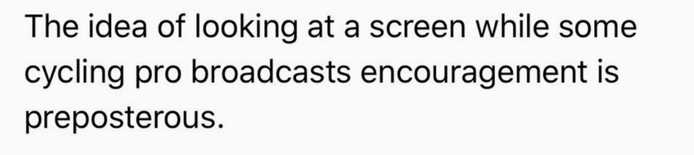 Again, where's the lie? There are maybe four people in the world I'd want broadcasting encouragement while I'm on a stationary bike, and not one of them is a cycling pro. (For the record, those four people are Chance the Rapper, Barack Obama, Dwayne "The Rock" Johnson, and former Nintendo President Reggie Fils-Aime.)