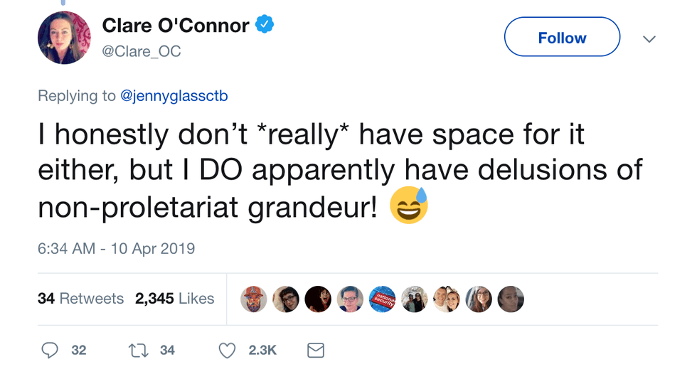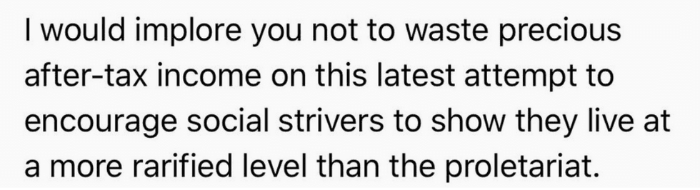 We can only imagine Claire's reaction to the email, but if I had to guess, I'd say she took a mental inventory of everything she's ever purchased in her life and sorted them into two columns: "Things I bought because I like them" and "Things I bought in an attempt to live in a more rarified level than the proletariat."