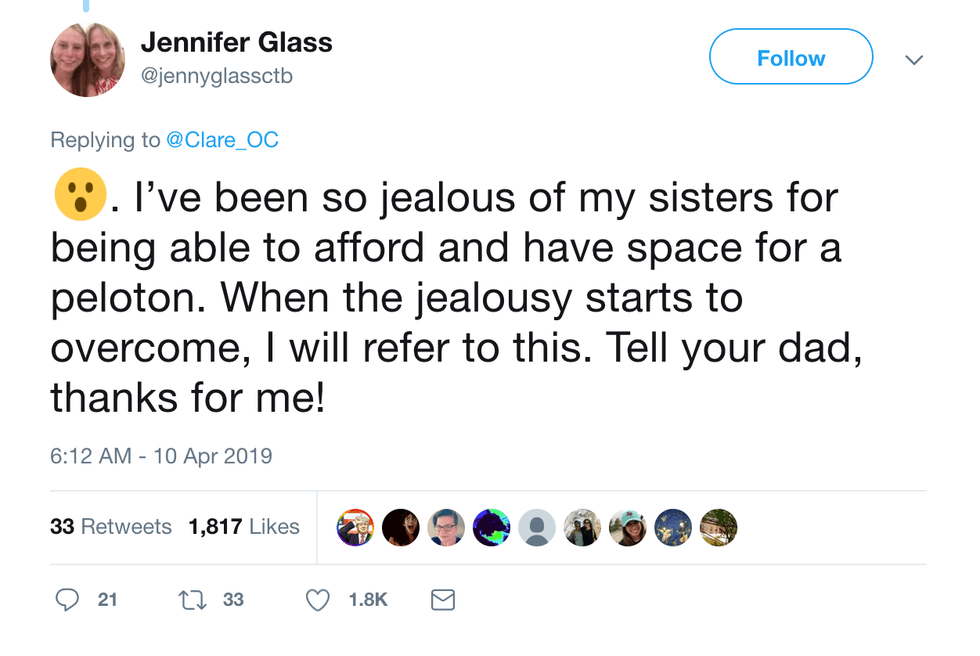There is still the possibility that Claire's dad is a little too set in his ways. What if — and this is just a hypothetical I'm throwing out there — but what if we should be treating ourselves to joy and, yes, frivolity, from time to time? There are some good aspects of buying a Peloton Bike as well!