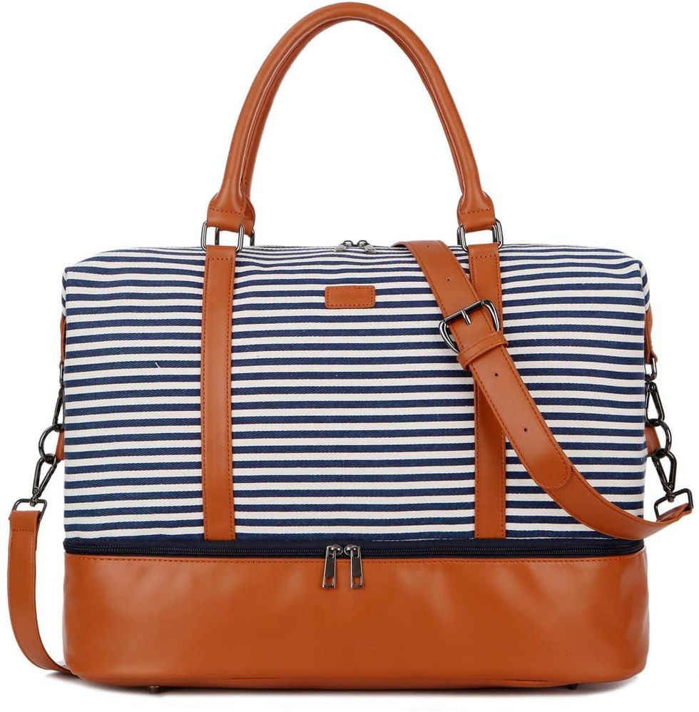 I have to say this first: my favorite thing about this bag is the super cool shoe compartment at the bottom. It keeps your shoes (or sweaty gym clothes) separate from the other items in your bag. How smart is that? Of course, you can't overlook the fact that this bag is way cute, with a blue-and-white stripe canvas body and faux leather trim. I could see making this my go-to bag for days when I need to lug a lot of stuff around (laptop, gym clothes, paperwork, etc.) or when I'm headed out of town for the night.
